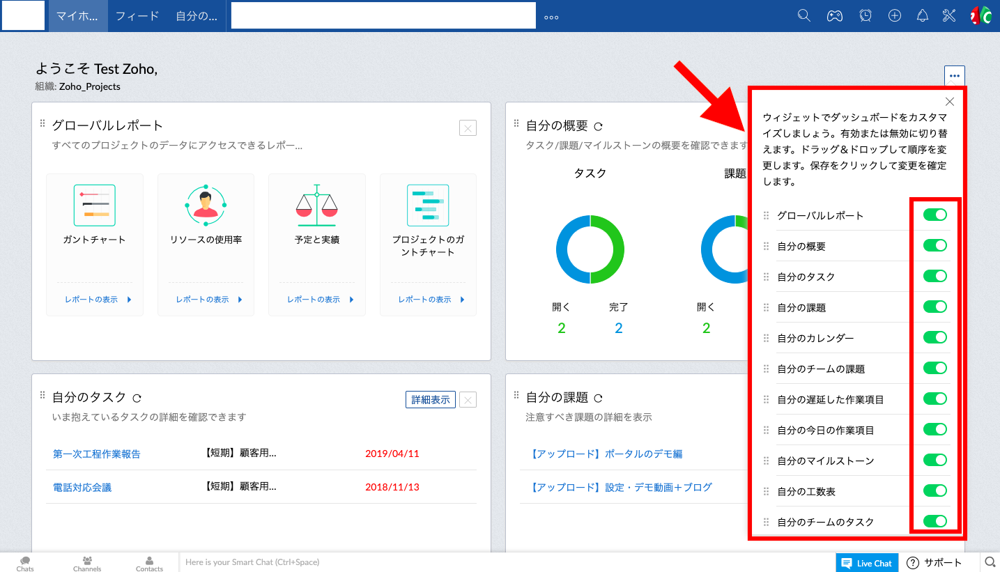 【Zoho Projects】上部に出てくるマイホーム、フィード、自分のプロジェクトのみだが、他の項目にカスタマイズできるか