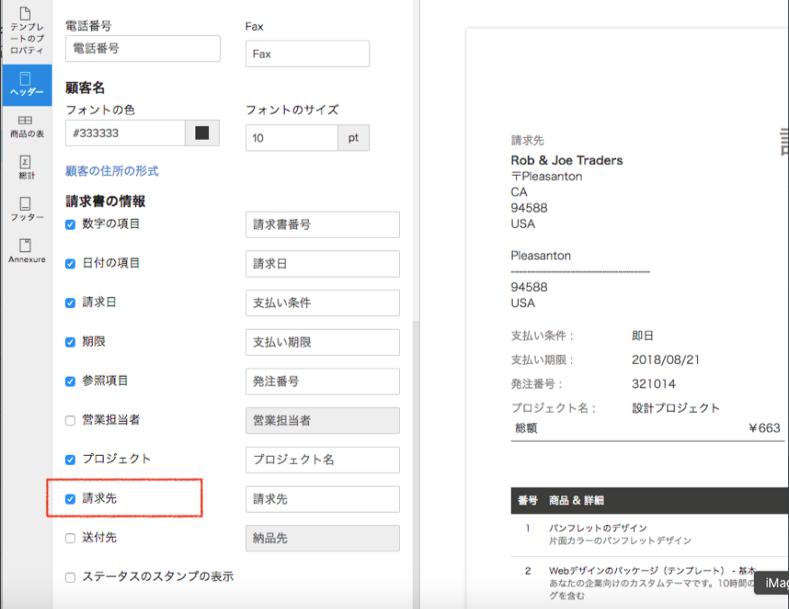 まず請求書のテンプレートで、請求先が表示されるようになっているかご確認ください。