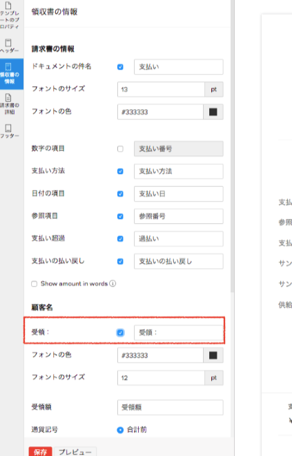 支払い受領のテンプレートの内容をご確認いただき、顧客名の、「受領」にチェックがついているかご確認ください。