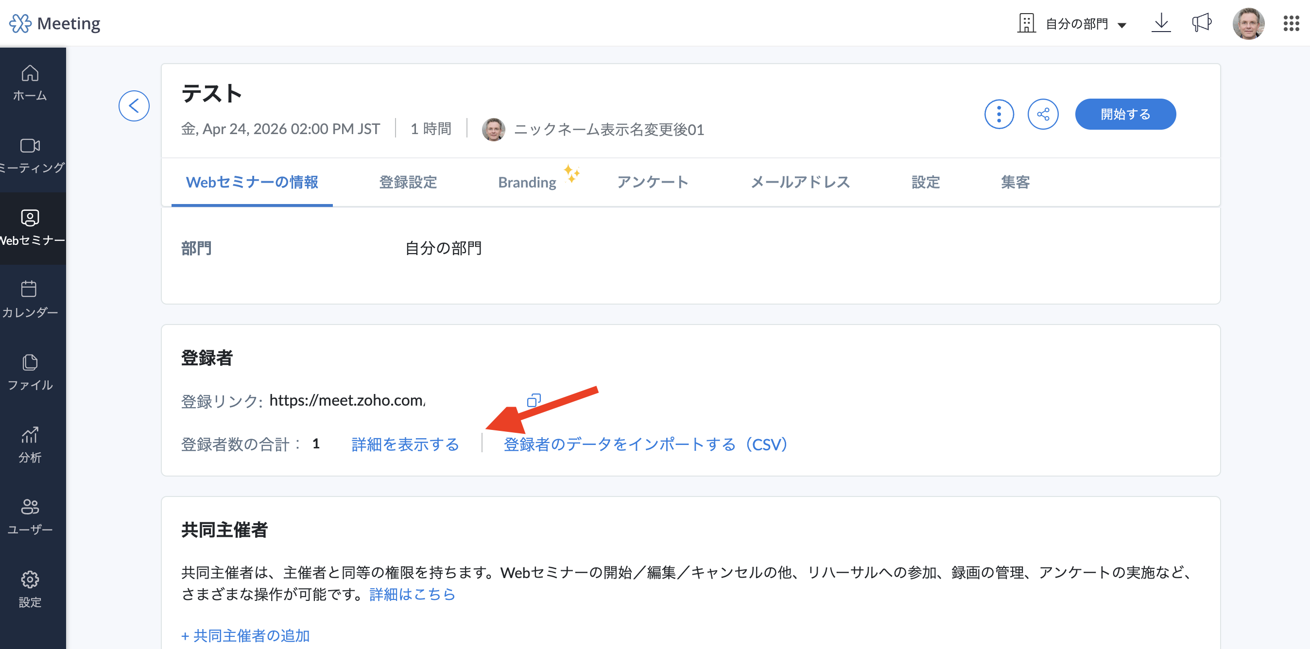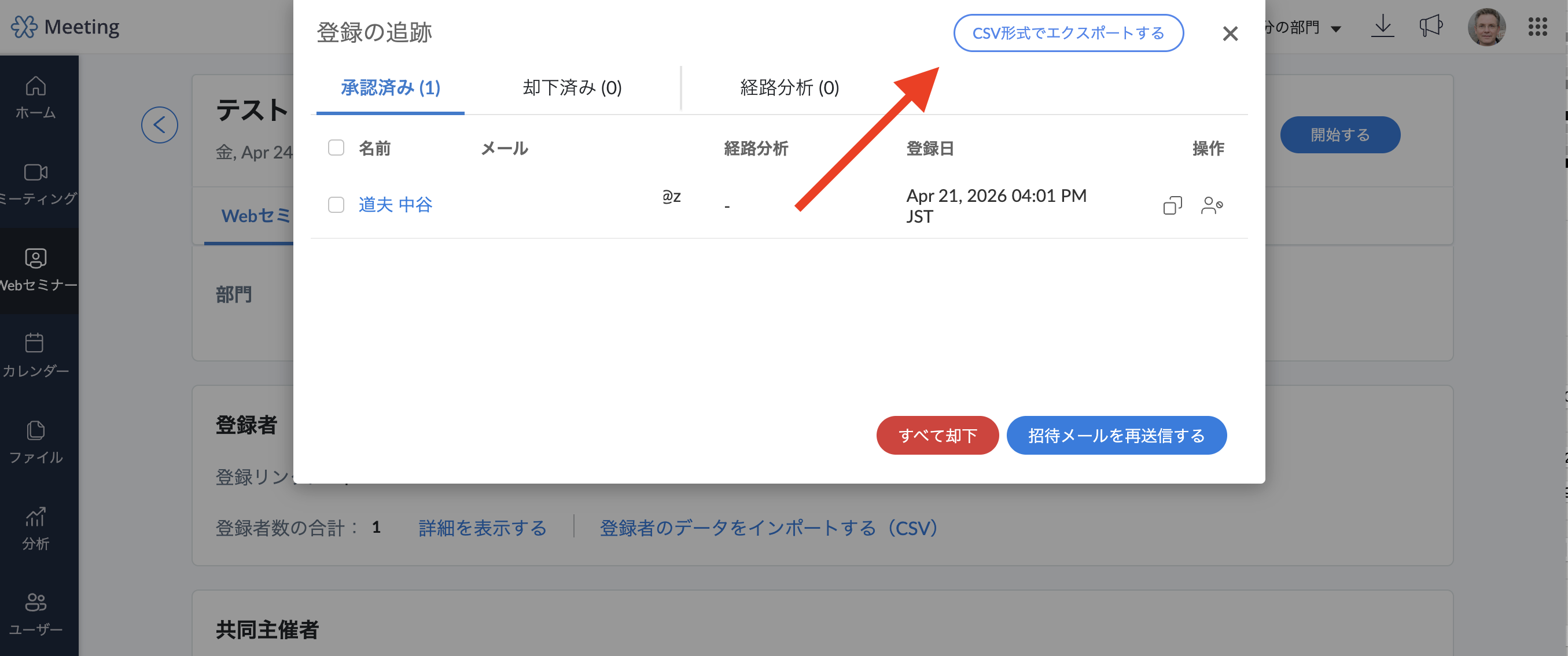 Webセミナー > 登録者 >詳細を表示する > CSVでエクスポートする