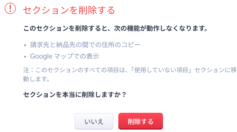 見込み客や連絡先タブの「住所情報」セクションを削除しようとすると、以下のような「Google マップで表示」機能が利用できなくなる旨のメッセージが表示されます。