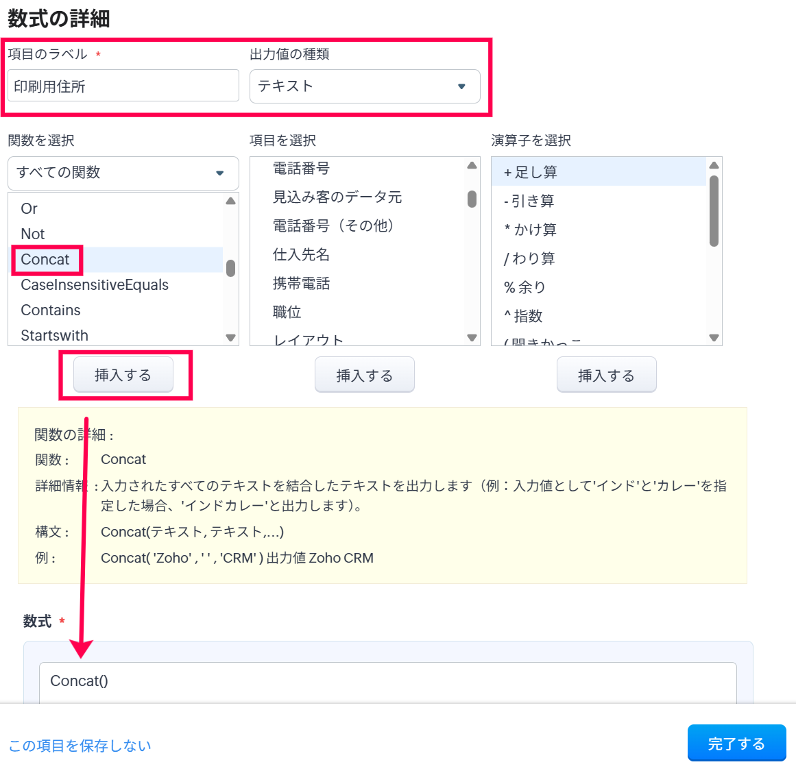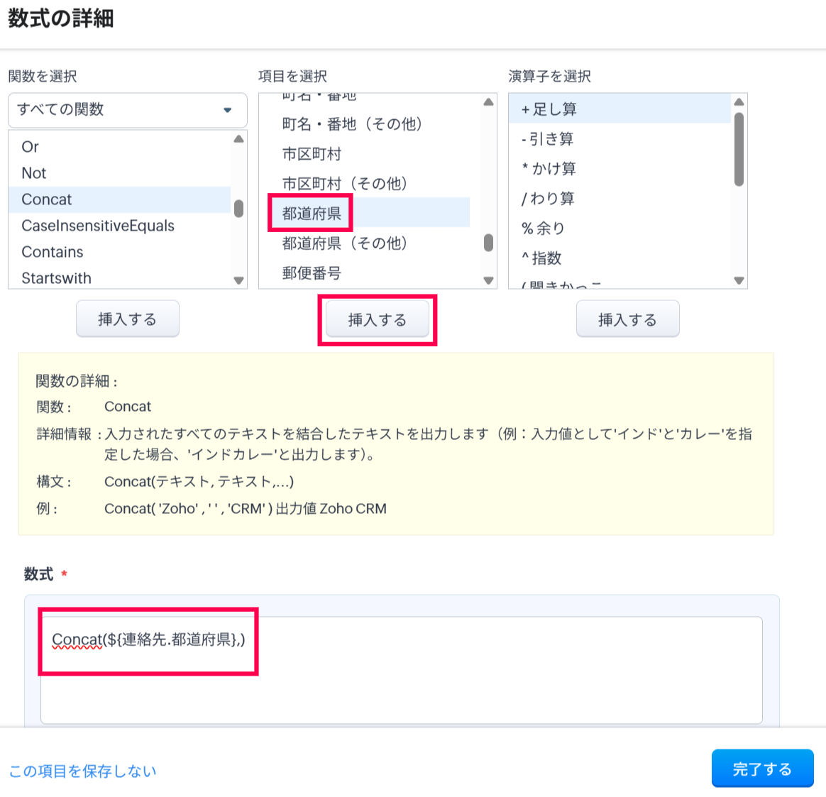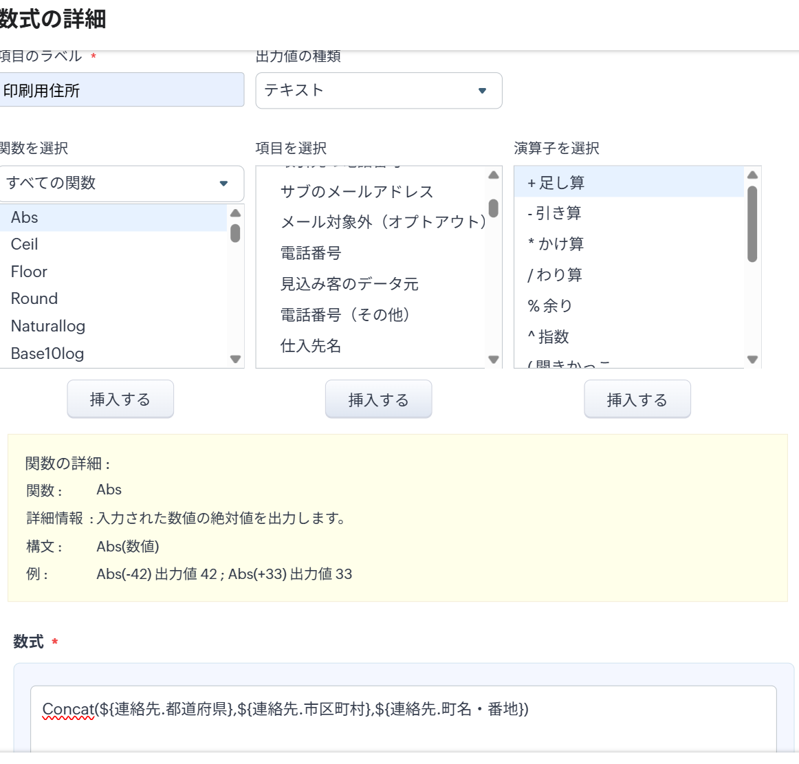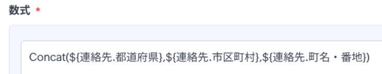 「数式」セクションに「Concat(${連絡先.都道府県},${連絡先.市区町村},${連絡先.町名・番地})」が表示されます。