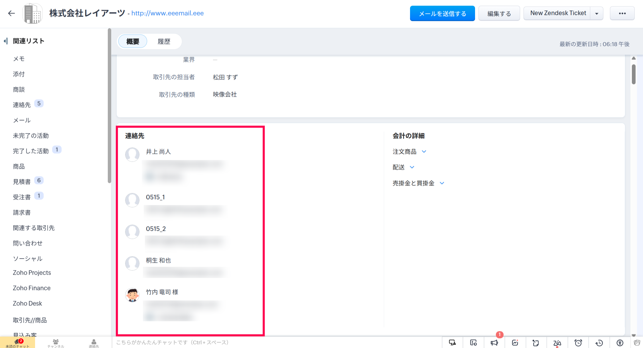 【Zoho CRM】取引先データの詳細画面を表示した時に表示される連絡先について