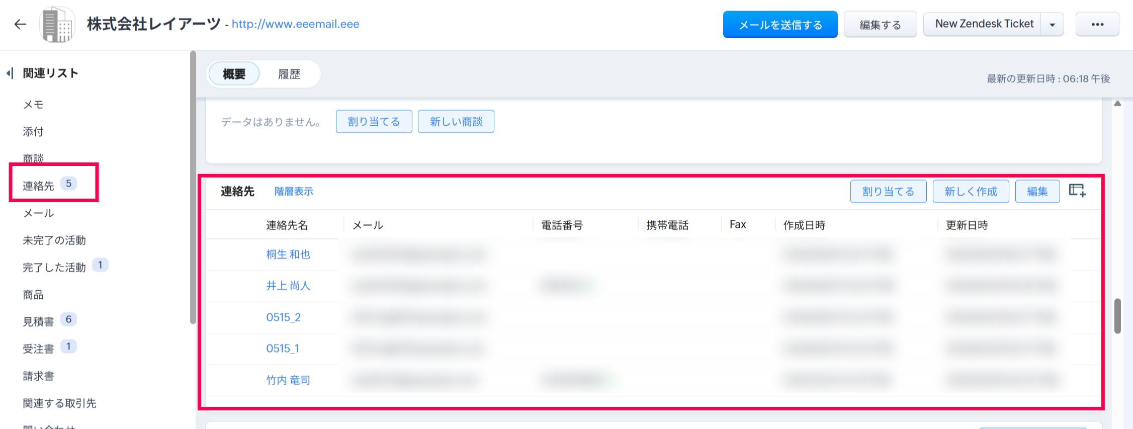 取引先データ詳細画面内の概要表示下に表示される連絡先5名は、連絡先データの更新日時が新しい順に表示されます。