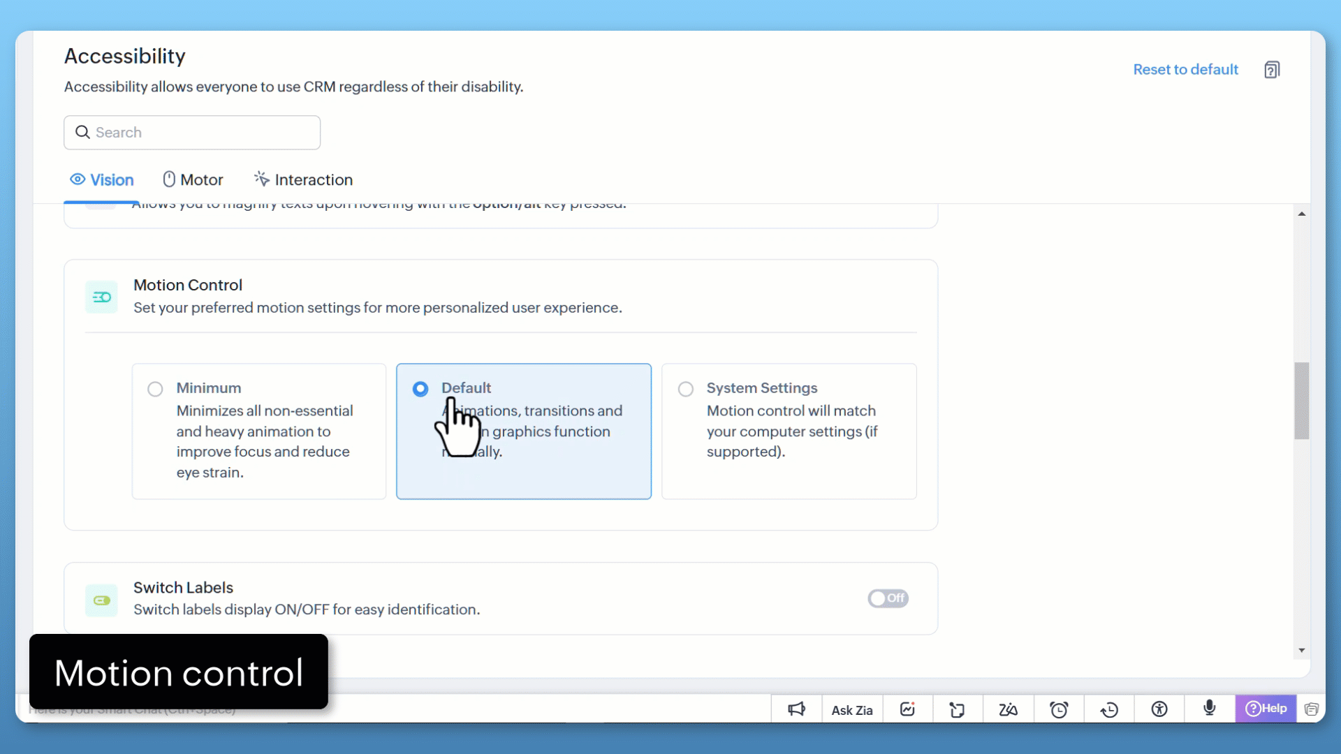 Zoho CRMを毎日利用している何百万人ものユーザー、特に障害を持つユーザーにとって、アクセシビリティコントロールは、彼らが能力を発揮するために必要なツールを提供します。 企業が特定の要件に合わせてCRMをカスタマイズできるように、個々のユーザーも18のアクセシビリティコントロールを活用して固有のニーズに対応できます。障害のないユーザーしか使えない「標準的な」CRMに対処する必要はもうありません。独自のニーズに合わせて設定できるCRMで、すべてのタスクを簡単に実行することができます。