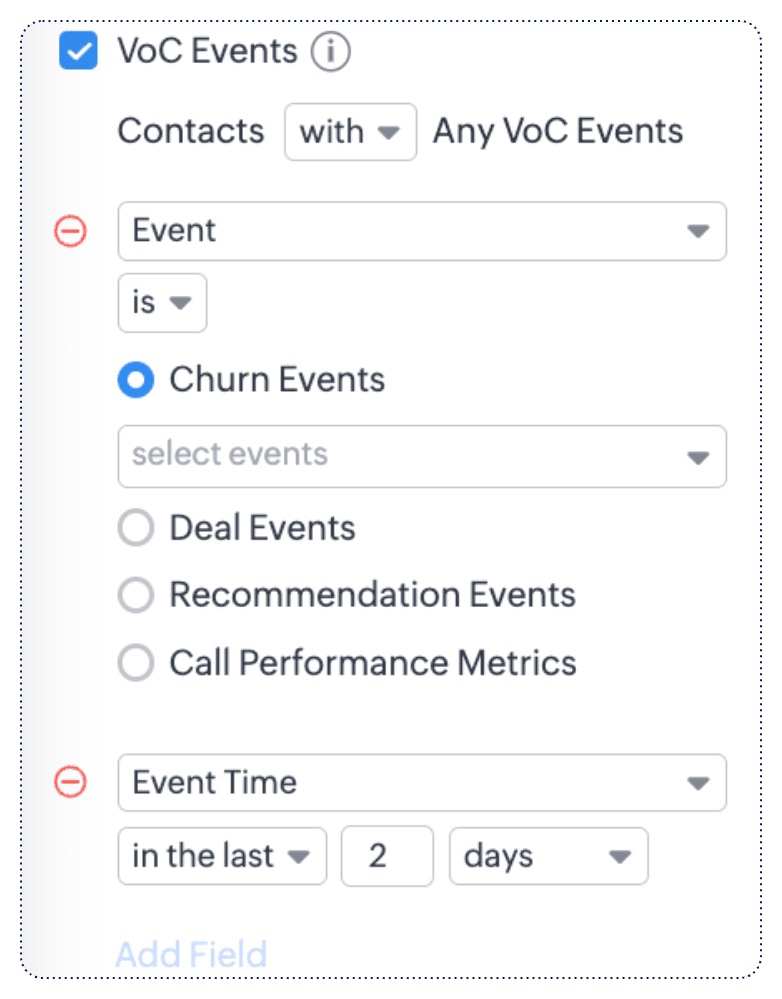 顧客の声分析に関する出来事は、顧客の反応に関して顧客データで観測される出来事、活動、または経過を指します。顧客がデータに関して行動するたびに、顧客の声分析機能ではそれを出来事としてログに記録し、行動と反応の関連性を理解するために、その行動の最中または後の反応を評価します。項目のフィルター(解約、レコメンド、見込み客、商談、活動)とは異なり、この機能では、反応中または反応後の行動に基づいて顧客データを表示します。肯定的であれ否定的であれ、顧客の行動に対して適切な対応を行うのに役立ちます。