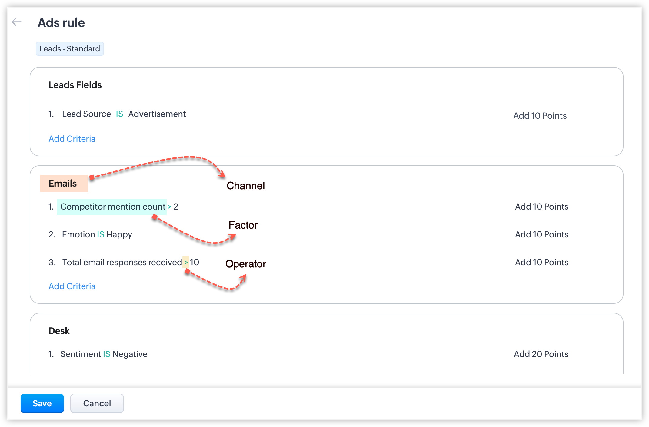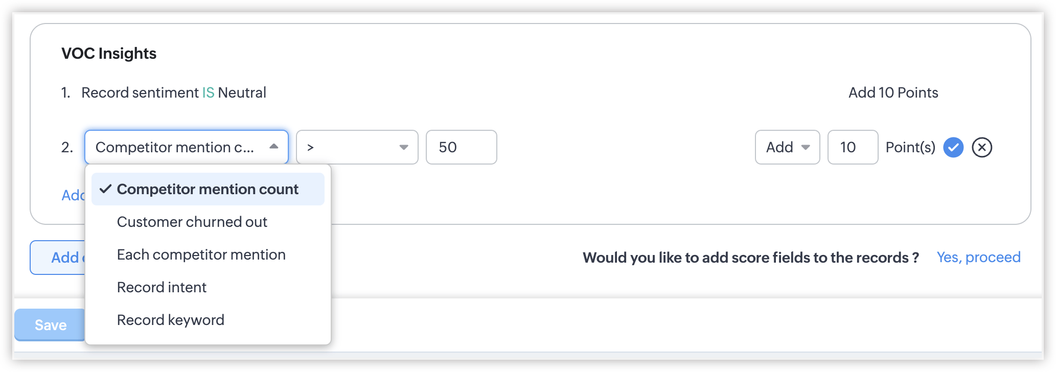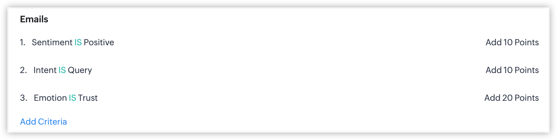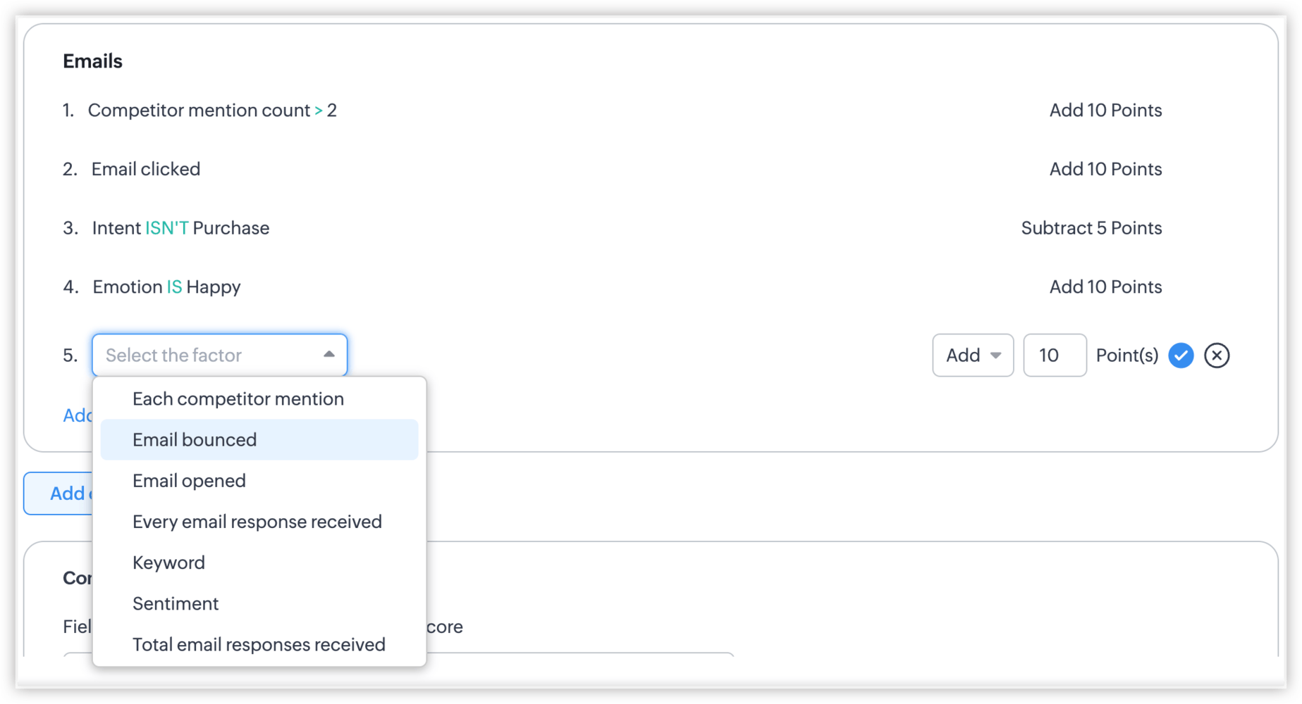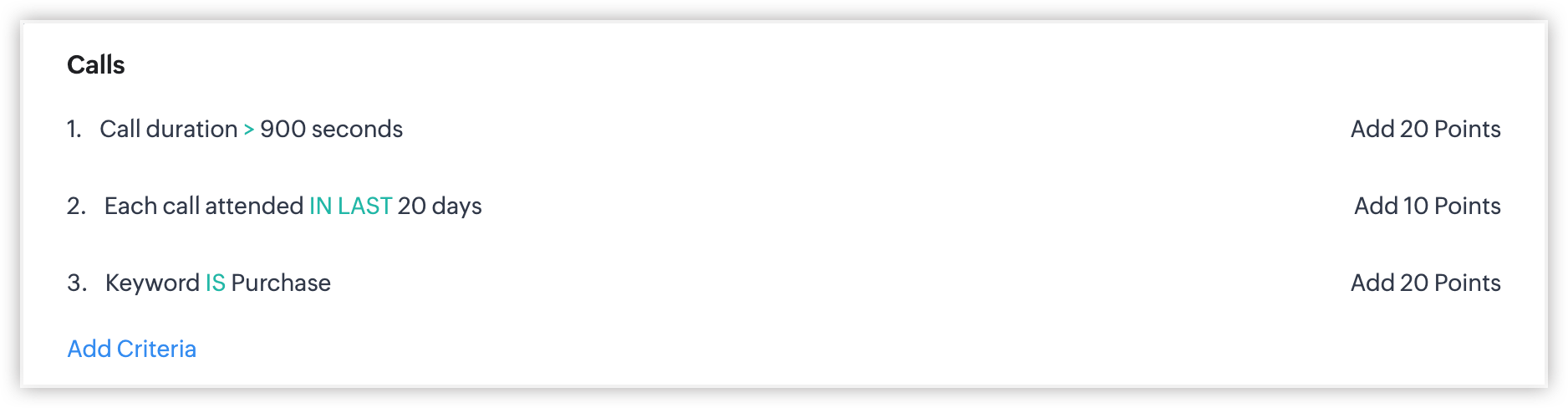 スコアリングルールには、特定の時間枠に対する条件の設定、数値の確認など、条件の演算子オプションが追加されています。例えば、過去20日間に通話した人に10ポイントを追加することができます。
