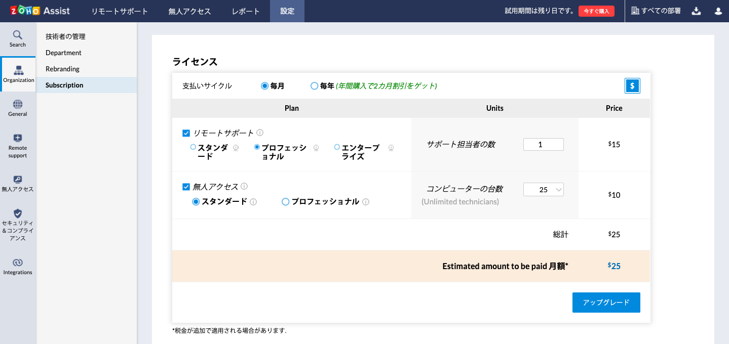 サインインした後、「今すぐ購入」もしくは設定>組織>Subscriptionをクリックし、プランの詳細を入力して「アップグレード」をクリックします。その後、Paymentsの画面へ進みますので、プランの確認と支払いの詳細を入力してください。
