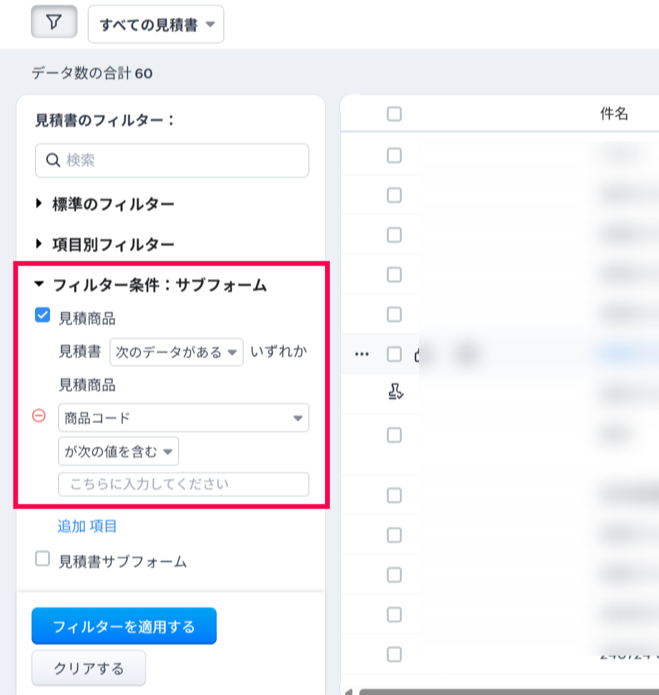 特定の商品コードを持つ商品データが「見積商品」サブフォームに登録されている見積書データを抽出するには、フィルターを以下のように設定します。