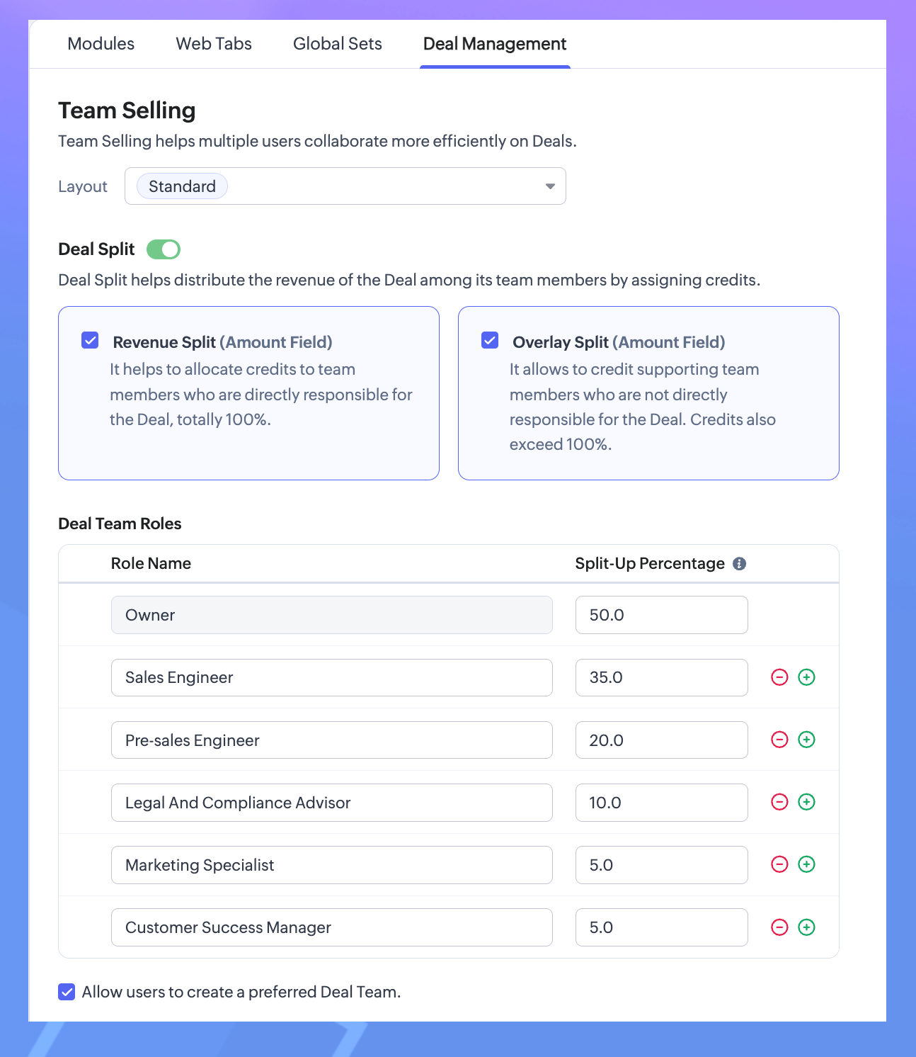 商談の配分設定の種類の両方が有効になっている場合、商談対応チームのメンバーには[売上額内の配分]の設定が適用されます。管理者は、メンバーに対して商談の配分の割合を割り当てなおすことができます。