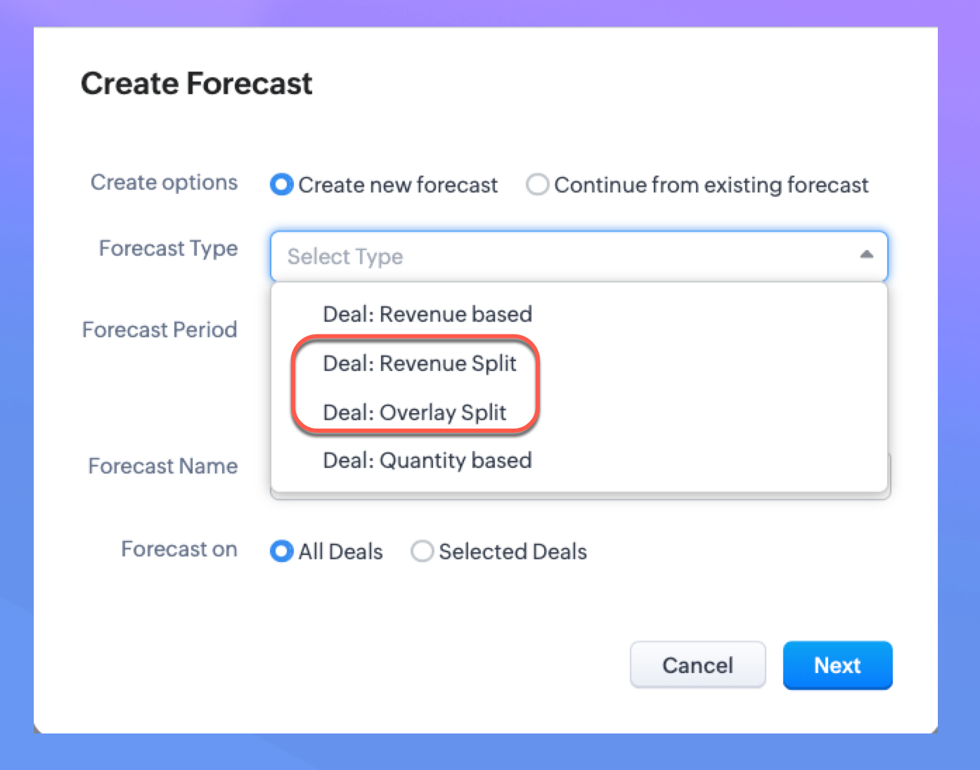 下記画像のように、売上予測の種類にて、商談の配分設定を選択することができます。