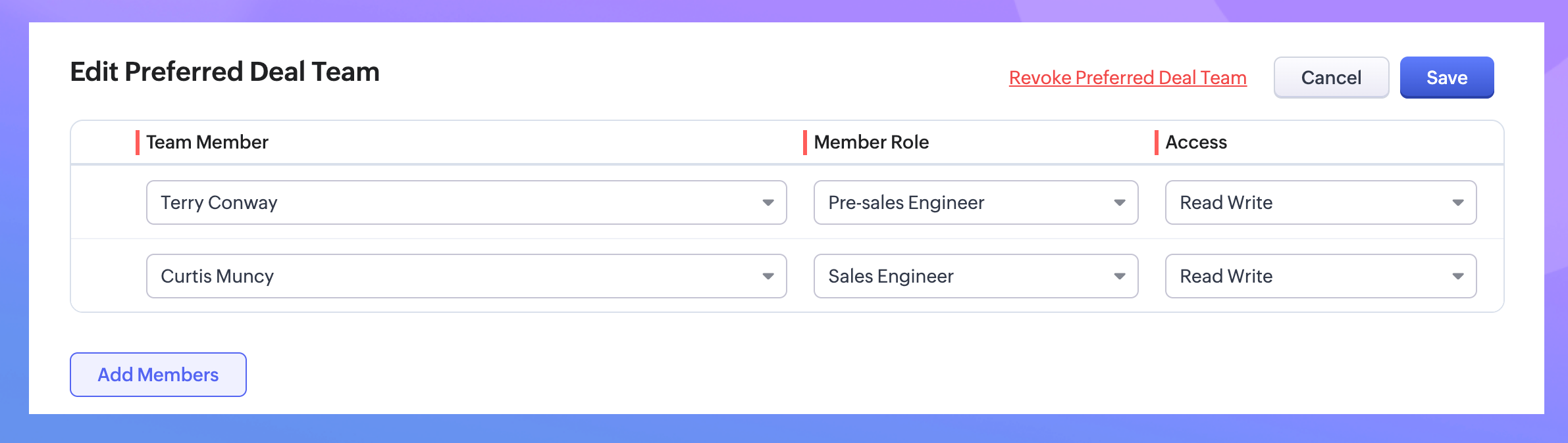 商談対応チームの編集にて、対象者の追加・削除や、商談対応チームの取り消しが可能です。