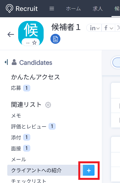 - 候補者の詳細画面を開き、画面左にある「クライアントへの紹介」にカーソルを合わせると表示される「+」をクリック