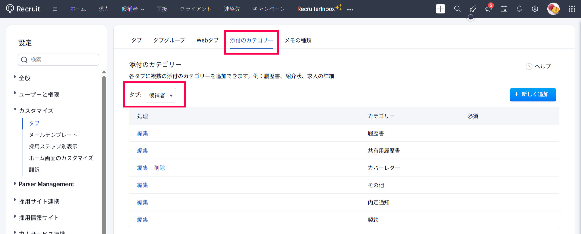 まずはじめに、送信時に候補者の資料が簡単に添付できるよう、添付資料のカテゴリーをカスタマイズしておきます。