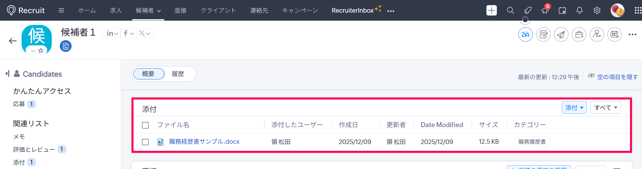保存が完了すると、候補者の詳細画面の「添付」関連リスト内に、追加した添付ファイルが表示されるようになります。
