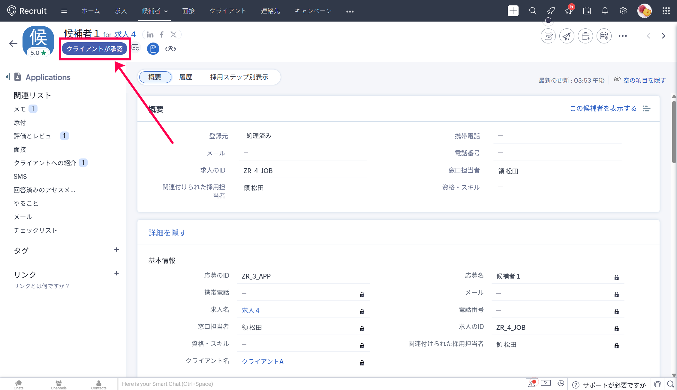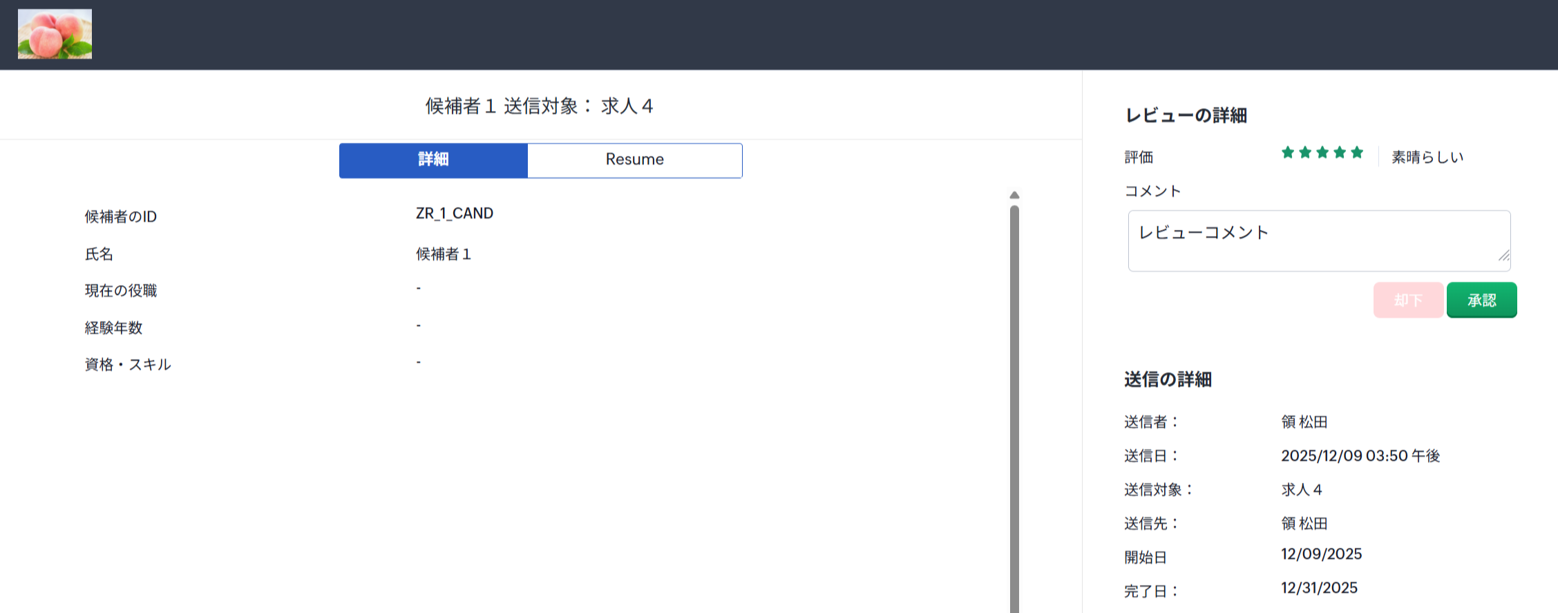 クライアントが承認/却下すると候補者のステータスが「クライアントが承認」または「クライアントが却下」に自動更新されます。