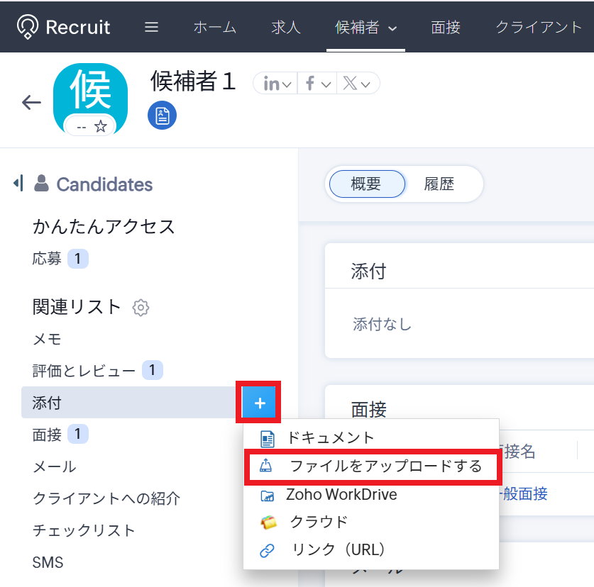 - 候補者の詳細画面を開き、画面左にある「添付」にカーソルを合わせると表示される「+」をクリックし、「ファイルをアップロードする」オプションをクリック
