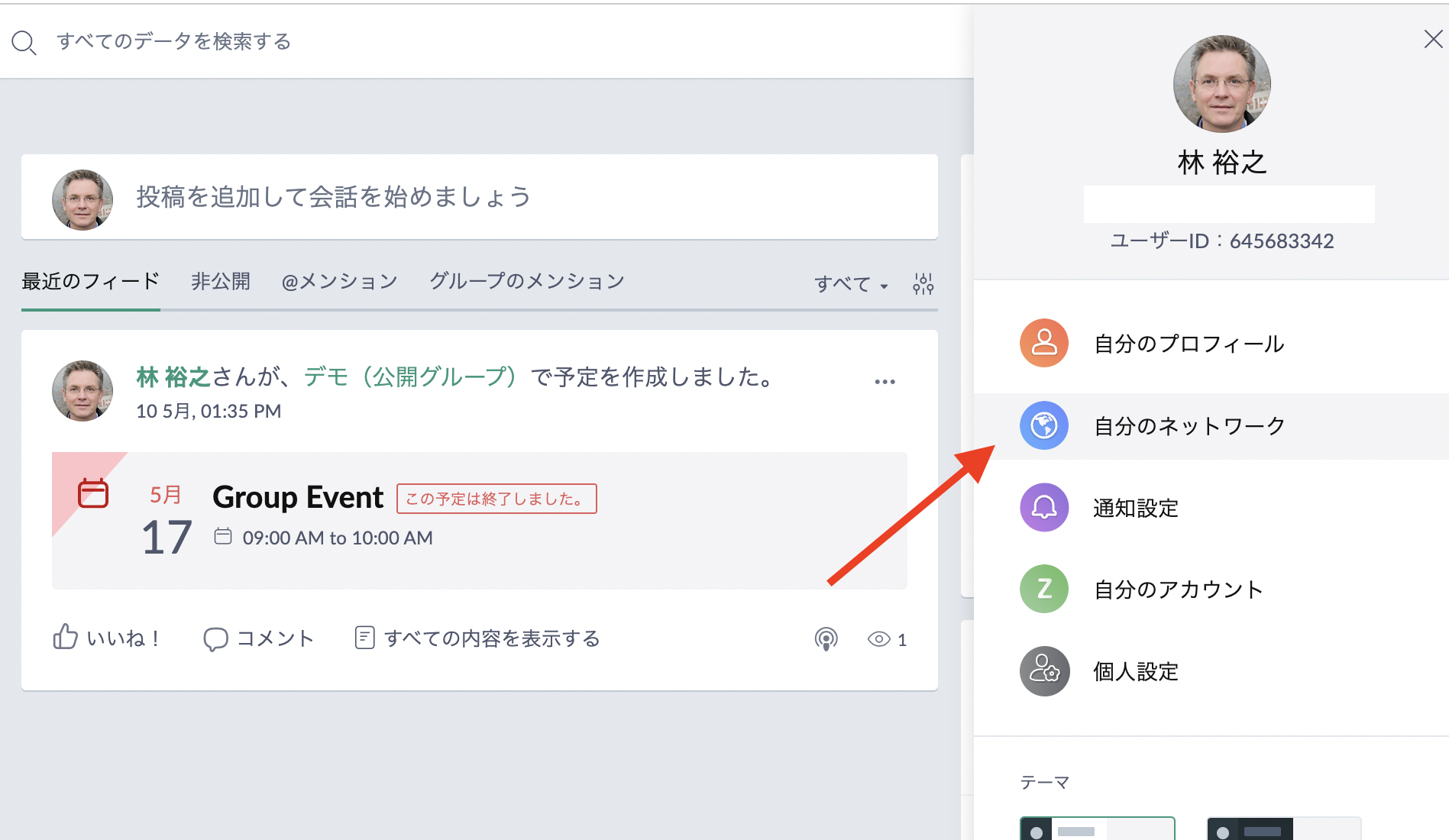 ネットワーク管理者でログインし、画面右上のプロフィールアイコン>自分のネットワークをクリック後、