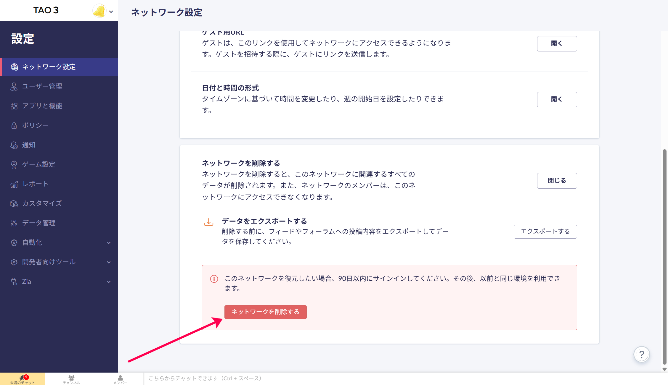 以下の「ネットワークを削除する」ボタンから、ネットワークの削除が可能です。