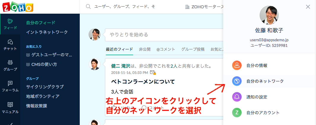 チャットの開始 チャットのメニューはブラウザ画面全体の一番左下に表示されています。ネットワーク内のメンバーとは、誰とでもすぐにチャットを開始できます。「連絡先」にその他のメンバーを個別に追加してチャットすることも可能です。連絡先の追加はZoho Cliqから追加できます。Zoho Connectのチャットは、Zoho CliqというZohoのチャットービスとの連携で機能しています。 準備:ネットワーク(組織)外の連絡先の追加 ...