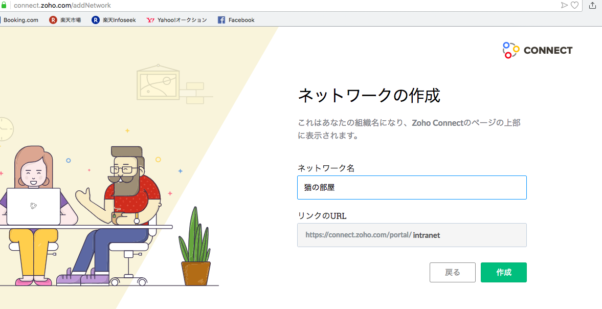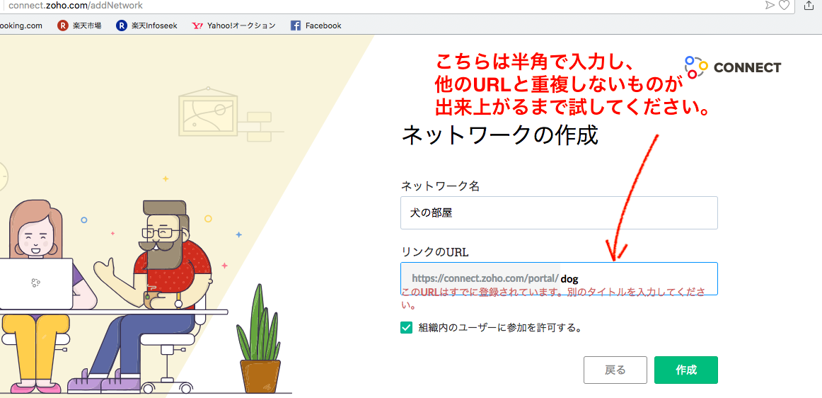 図のように、ネットワークの名前以外にも、ネットワークのURL(半角ローマ字)で入力します。既存の外部ネットワークと被らない半角ローマ字を入力してください。
