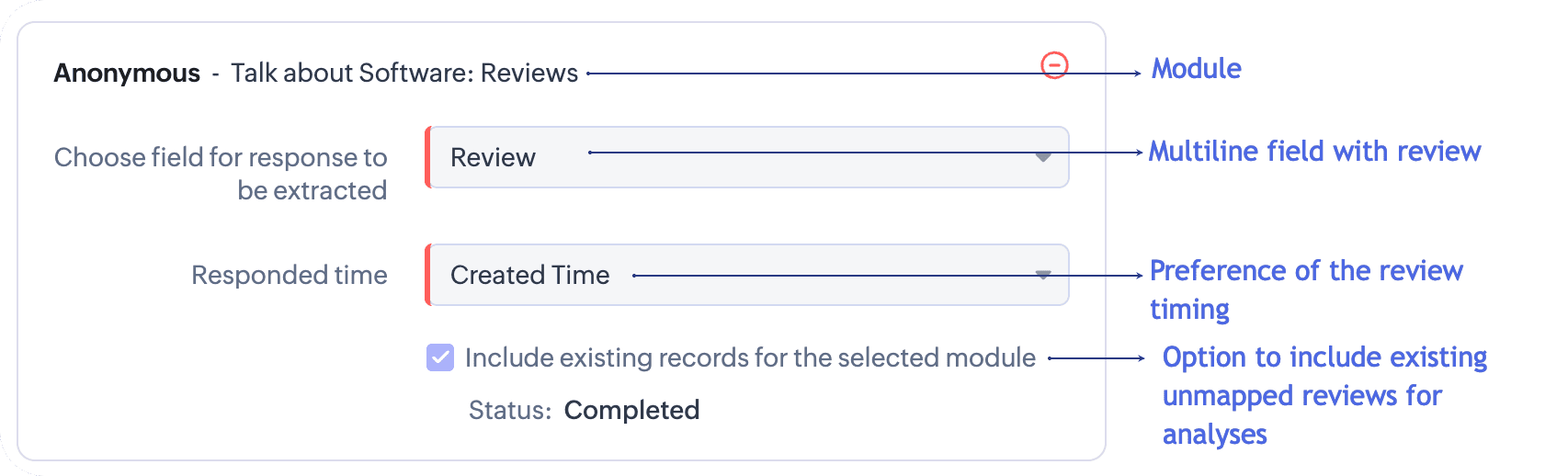 行うべき操作は、(顧客の声分析設定で使用しているかどうかにかかわらず)レビューを保存しているタブを関連付けし、レビュー対象の項目を選択するだけです。これにより、顧客の声分析ではこれらの匿名レビューを含むインサイトを表示できるようになります。