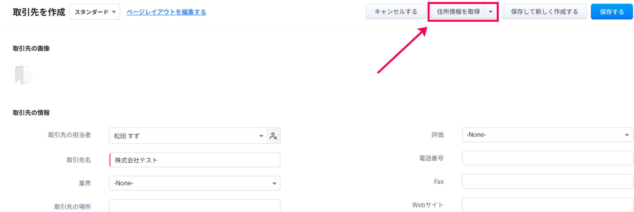 上記プラグインのインストールが完了しますと、取引先データの作成画面や編集画面に「住所情報を取得」ボタンが表示されます。
