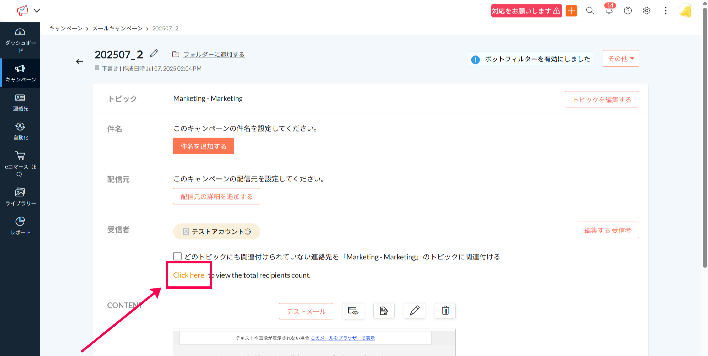 キャンペーンの受信者(リストもしくはセグメント)を設定後に表示される「Click here」リンクをクリックすることで、配信対象となる連絡先数が表示されます。