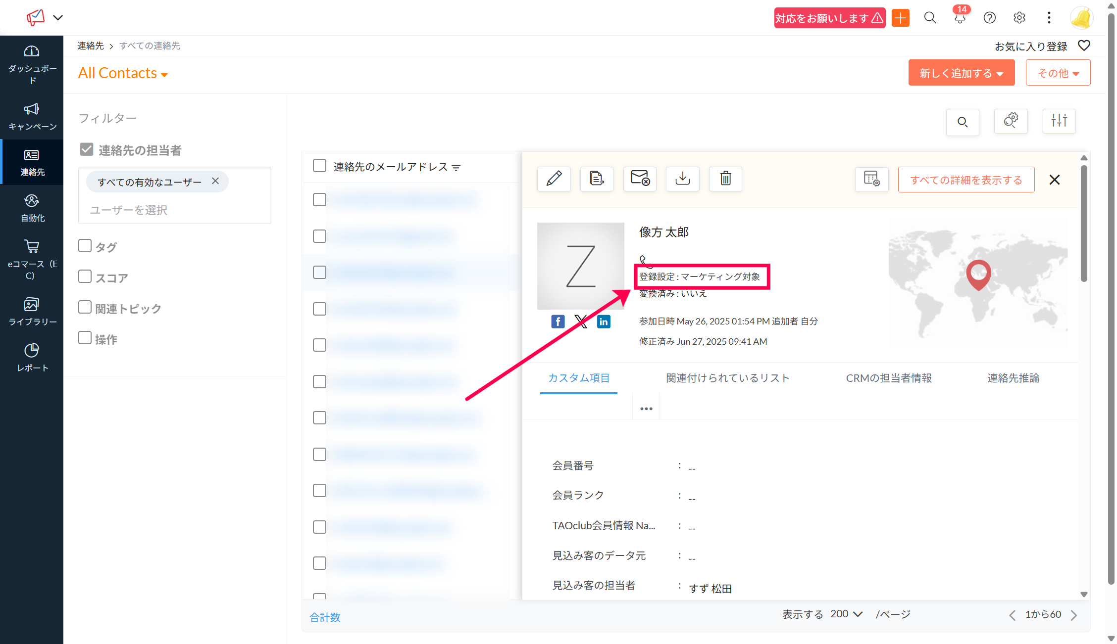 「マーケティング対象」か「マーケティング対象外」かは連絡先ビューで確認できます。