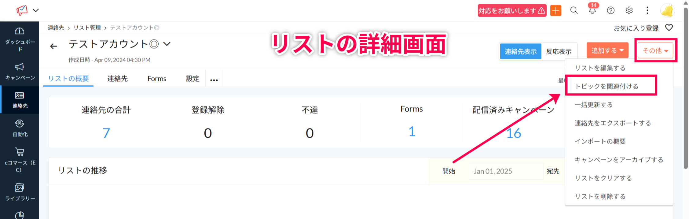 その場合、受信者のリストやセグメントの詳細画面に移動し、以下のオプションより受信者のリストやセグメントに含まれている連絡先にトピックを関連付けるようにしましょう。