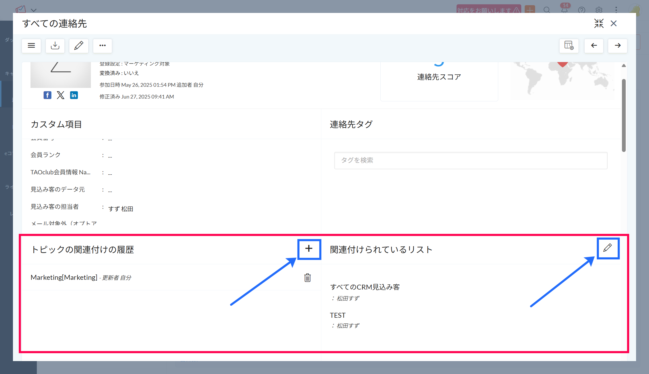 なお、上記画面内の「すべての詳細を表示する」ボタンをクリック後、画面を下にスクロールすることで、連絡先に関連付けられているトピックやリストが確認できます。