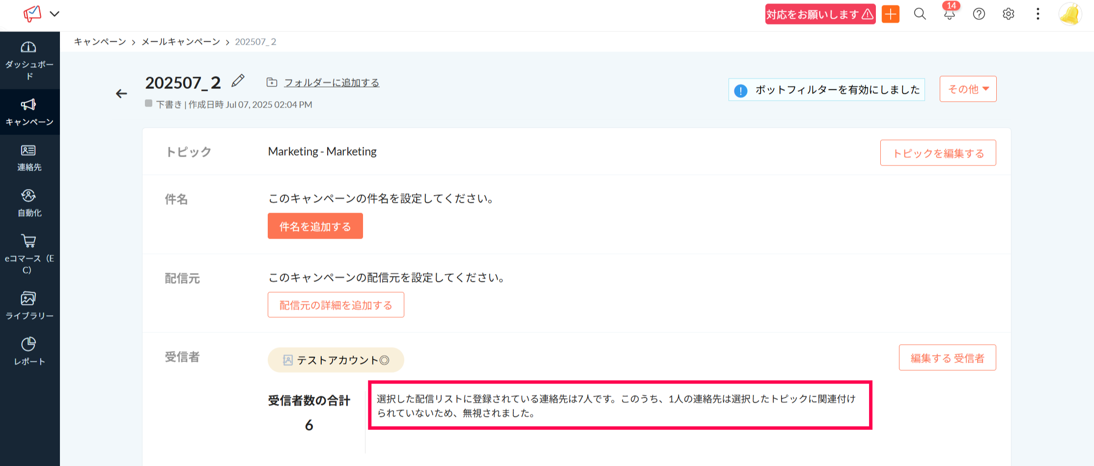 受信者として設定しているリストやセグメント内に含まれる連絡先数の合計と、「受信者数の合計」として表示された連絡先数に大きく差がある場合、受信者のリストやセグメントに含まれる連絡先に対し、設定したトピックが関連付けされていないことが想定されます。