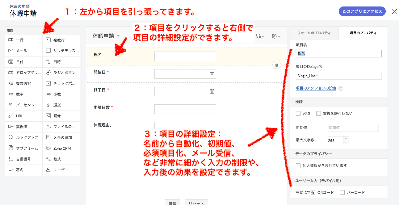 基本的な操作や設定については、プログラムの知識や経験は必要なく、ドラッグ&ドロップの直感的な操作でアプリを作成できます。フォーム提出のボタンを「申請」