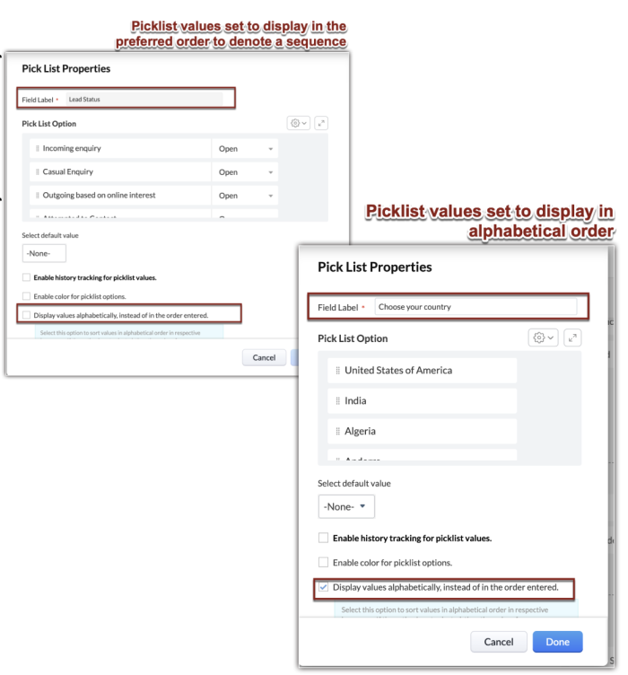 例えば、国名項目では、値をアルファベット順に、見込み客のステータス項目では、値を入力順に並べることができます。