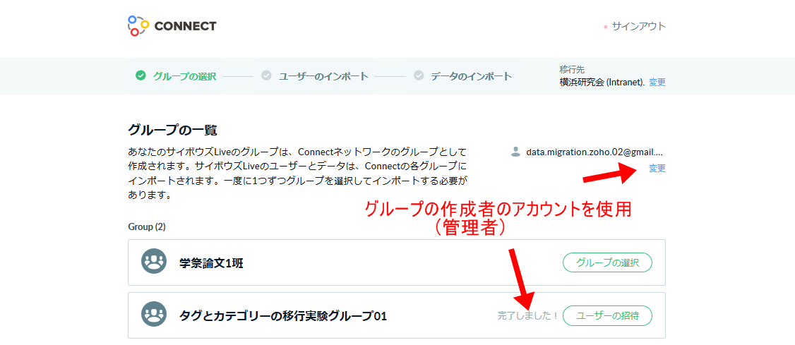 はい、同じネットワークに同じサイボウズグループは一回しか移行できませんが、もし移行を取り消したい場合は、support@zohoconnect.comまでメールにてご連絡ください。Zoho管理者アカウント、サイボウズ管理者アカウント、取り消したいグループをお伝えしていただけますとスムーズです。