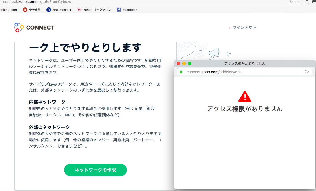 ネットワーク作成の過程で以下の画面が表示されたら、ネットワーク管理者でログインしていない可能性があります。詳細は、上の1)ネットワーク管理者のアカウントで移行ページにログインしているかをご参照ください。