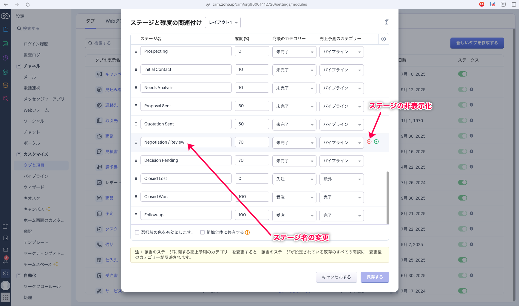 【Zoho CRM】商談のステージ名の変更/ステージの削除方法