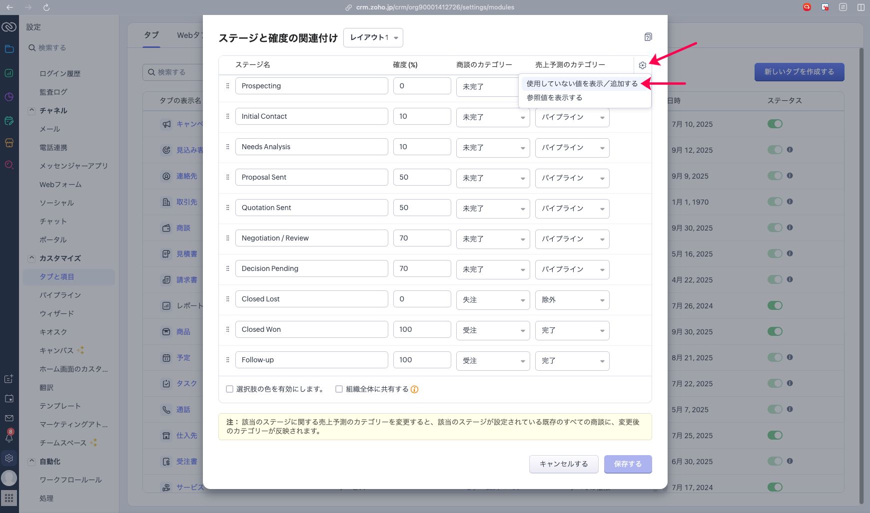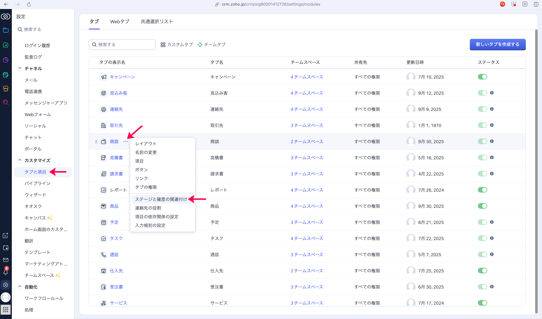 1. 設定>カスタマイズ>タブと項目>商談タブ右側の「・・・」>[ステージと確度の関連付け]の順に移動してください。