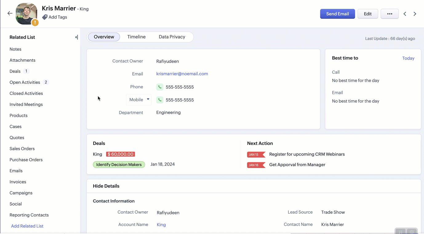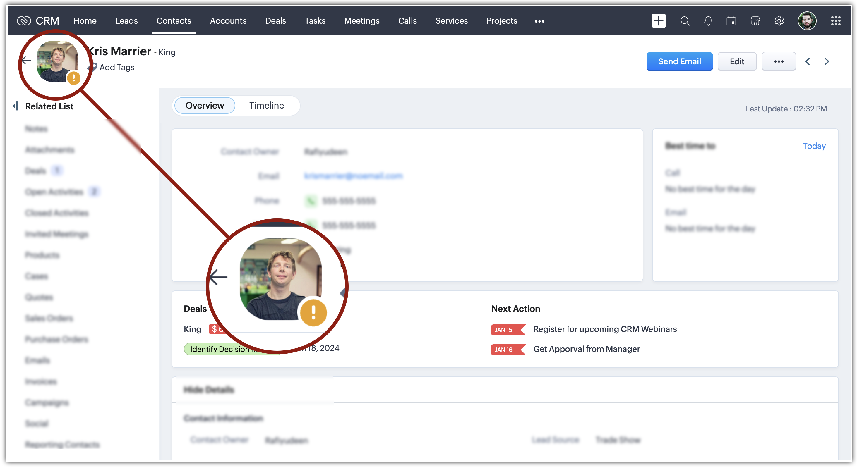 この機能が便利なもう一つのシナリオは、イベント企画会社がZoho CRMを使って大規模な会議の出席者情報を管理する場合が挙げられます。VIP出席者のプロフィールを確認する際、イベントコーディネーターが出席者の写真のアイコンをクリックします。
