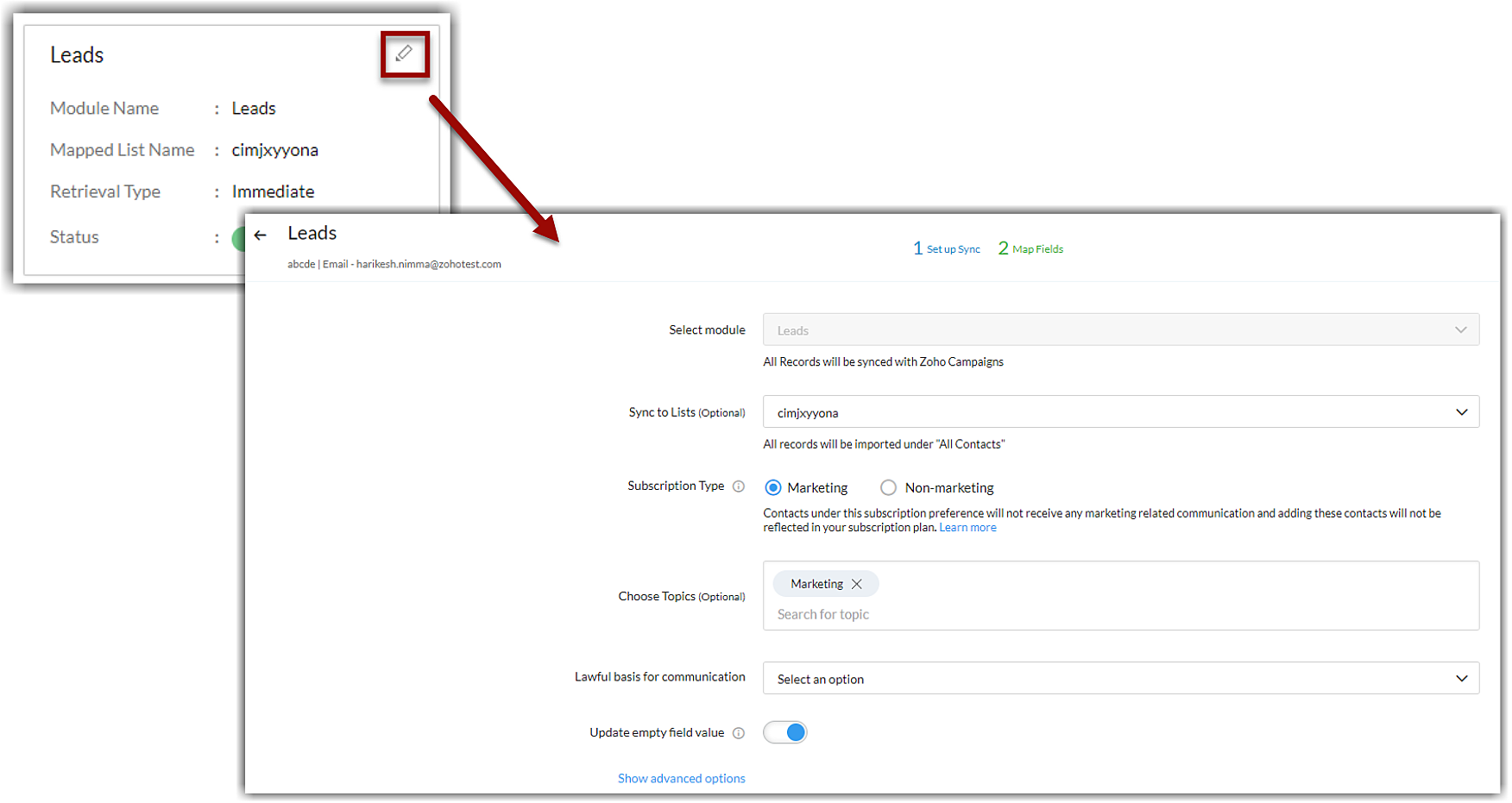 - 新バージョンで作成された同期では、編集オプションのみが利用可能で、編集アイコンをクリックするとZohoCampaignsの同期編集ページにリダイレクトされます。