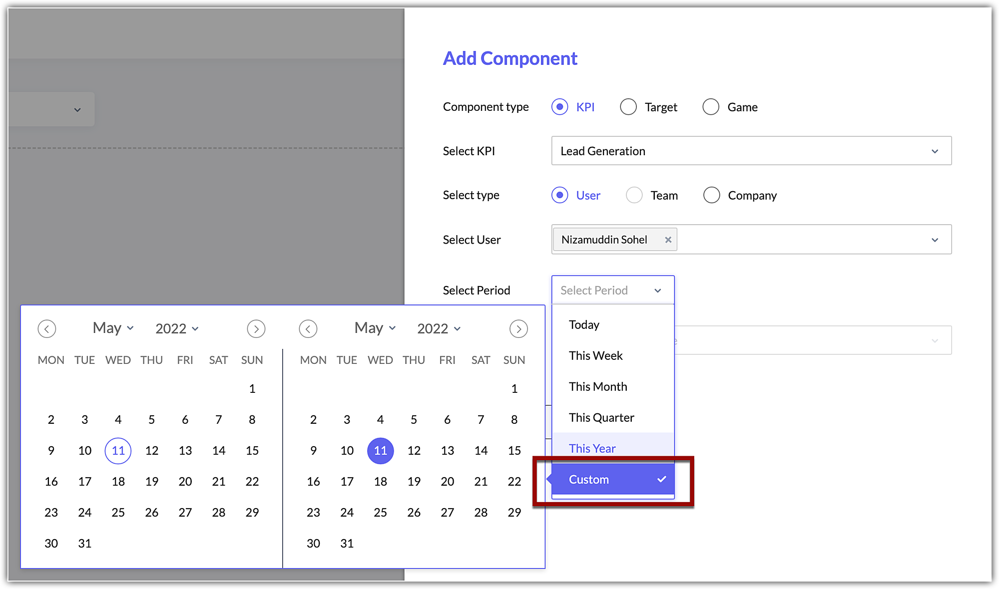 KPIのダッシュボード要素を作成する際に、今日、今週、今月などの既存オプションとは別に、カスタム期間(個別設定)を選択することができるようになりました。