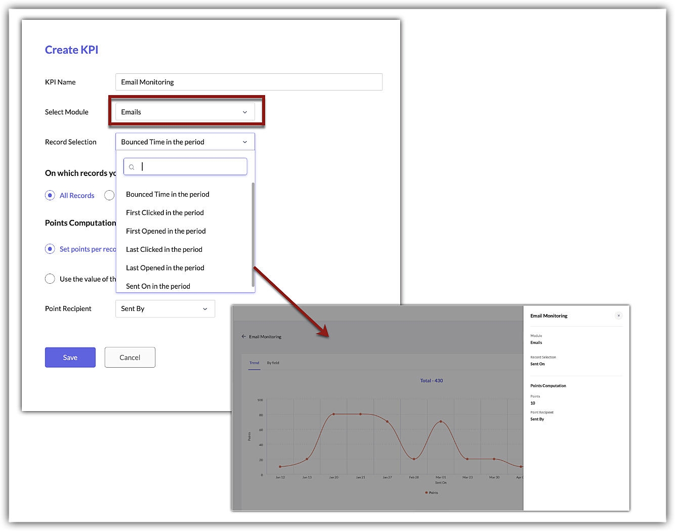 メールは、ビジネスのやり取りにおいて重要な役割を果たします。対象期間内のメール送信、初回クリックなどのパラメータを選択し、ポイントを付与するKPIを作成して、グラフで成果を測定することが可能です。
