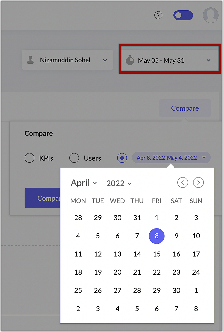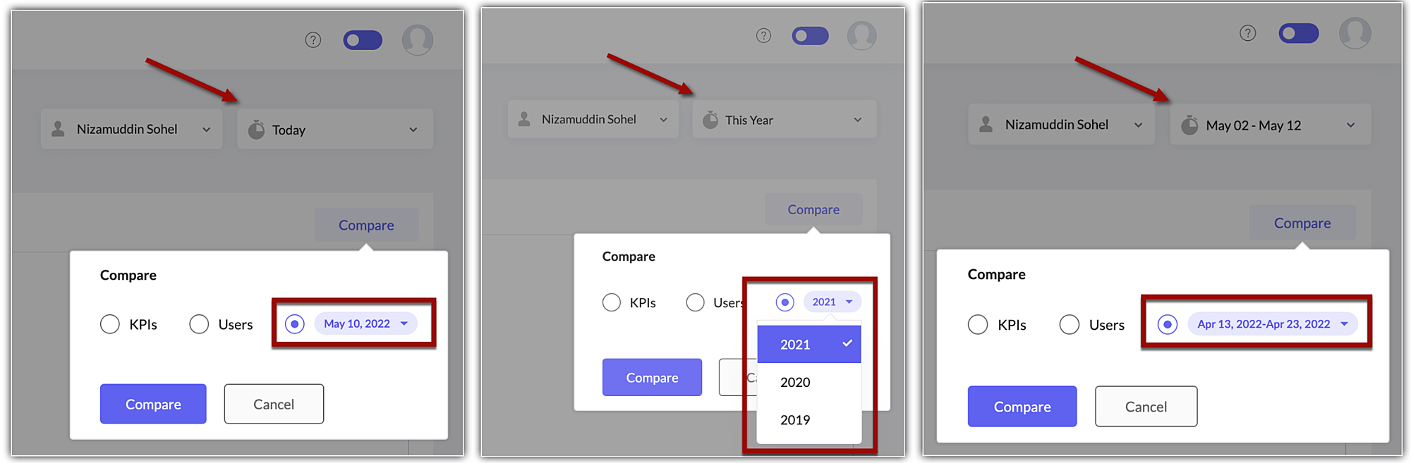 例えば、今週1週間の傾向であれば、カレンダーオプションから7日間の任意の期間と比較することができます。また、今日の傾向は、カレンダーから他の日と比較することもできます。傾向が20日間のカスタム期間である場合、カレンダーから20日間の任意の期間と比較することができます。