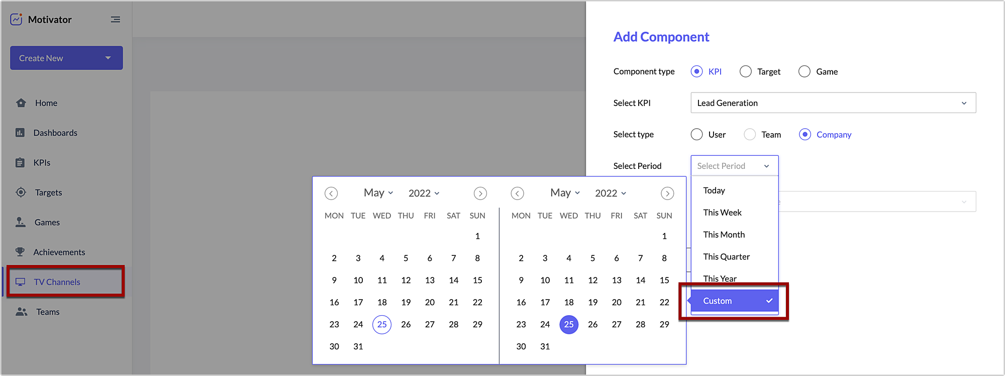 モチベーターを使用して、独自のKPIの作成、売上目標の設定、ゲームの作成、達成度を表示するディスプレイ用チャンネルの設定など、様々な設定が可能です。