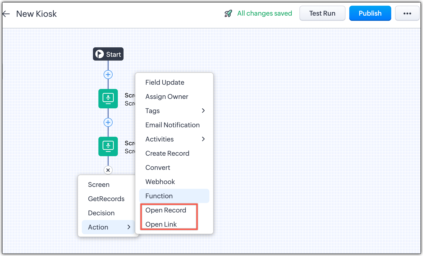 キオスク内のナビゲーションを強化するために2つの新しい処理:「リンクを開く」と「データを開く」を追加しました。これらの処理は、キオスクのフローの連続性を維持しながら、外部リソースまたはデータへのアクセスを提供し、デフォルトで新しいタブで開きます。