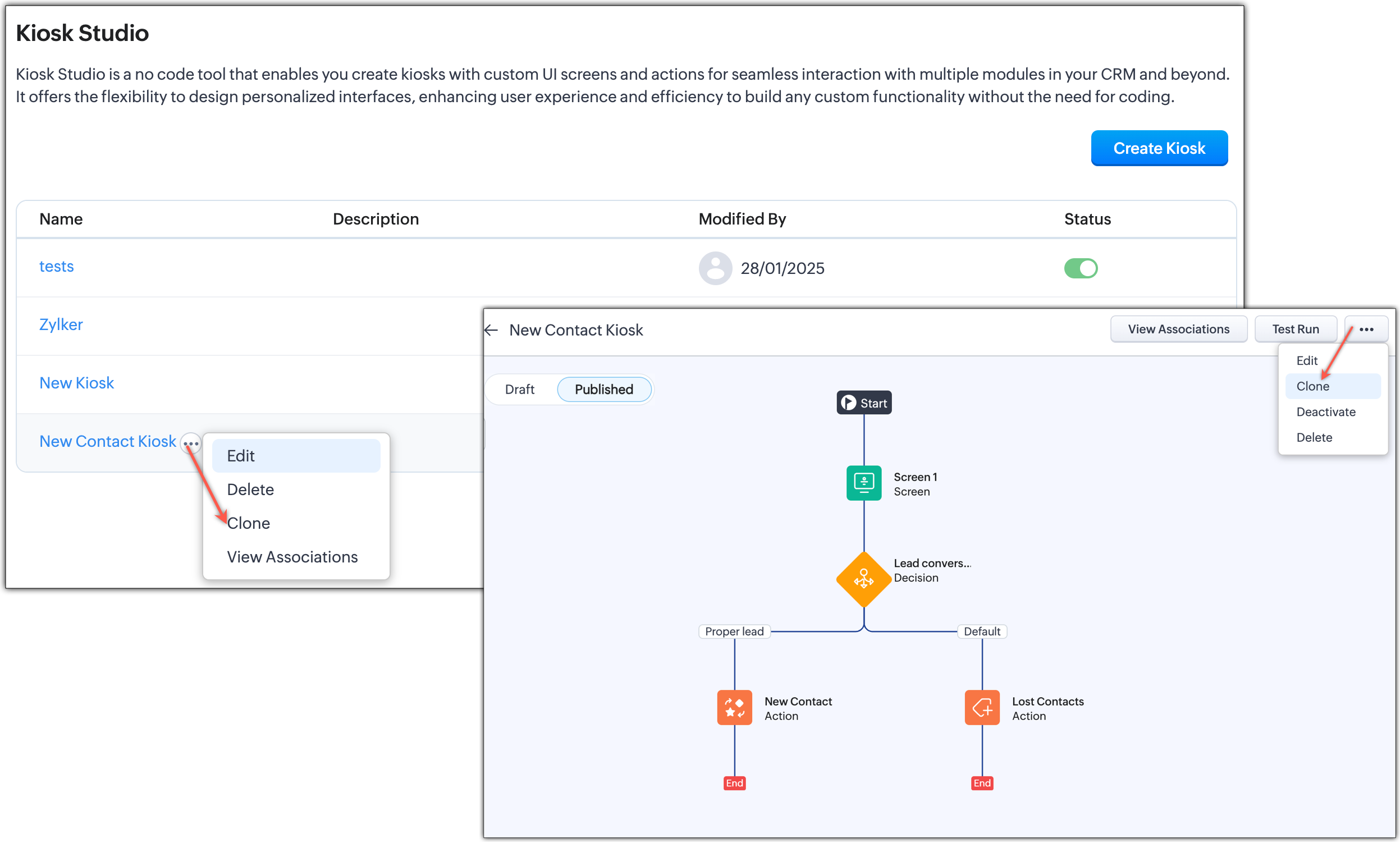 キオスクの有効なバージョンを複製して、再利用やカスタマイズのために既存キオスクの設定を複製できるようになりました。ユーザーは、元のキオスクに影響を与えることなく、複製されたバージョンを変更することで特定ユースケースのバリエーションを作成できます。これは、時間と労力を節約し、ゼロからキオスクを再作成する必要がなくなります。