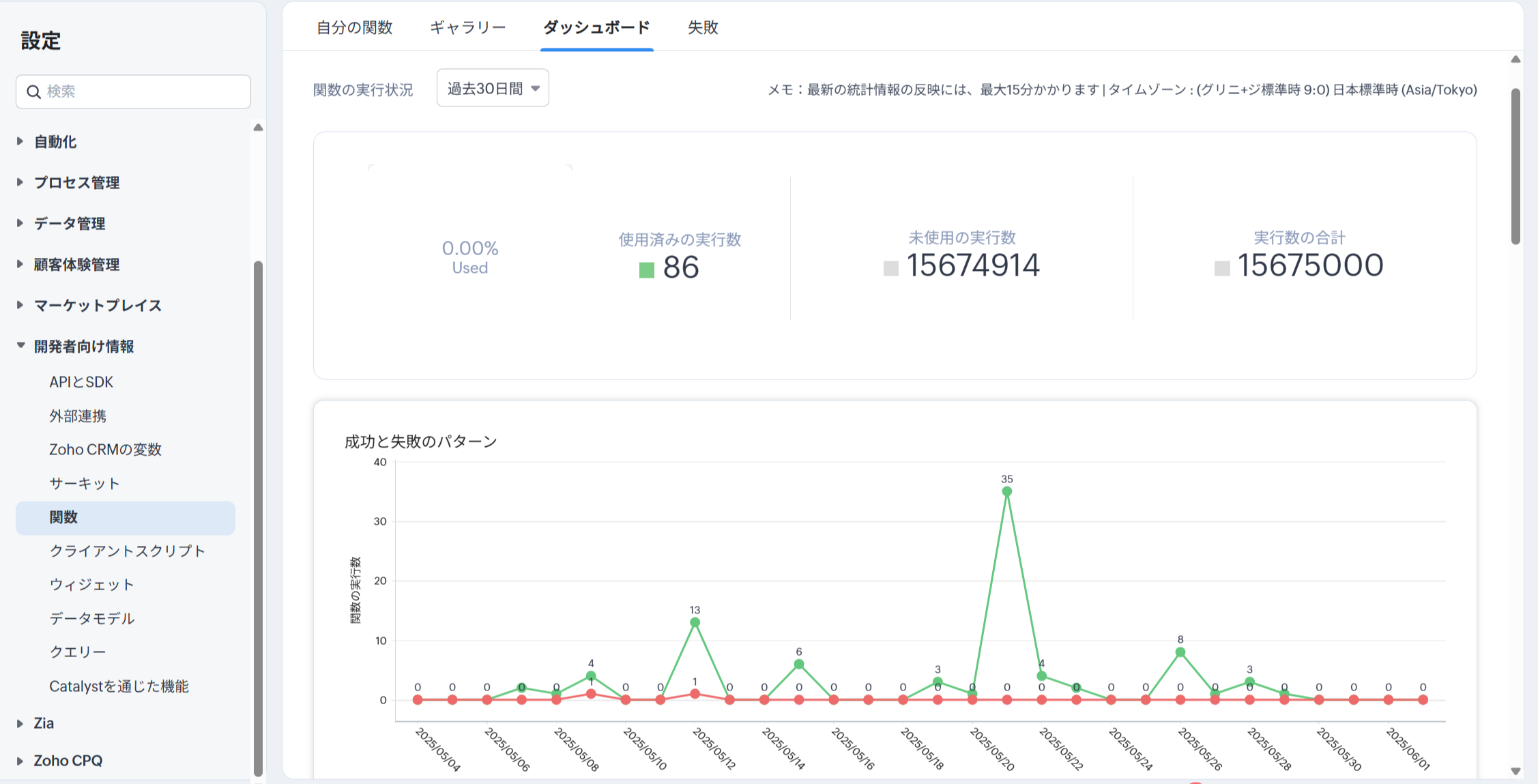 設定>開発者向け情報>関数>ダッシュボード画面では、関数の実行回数や最も実行された関数など、関数の実行状況に関するデータを確認できます。