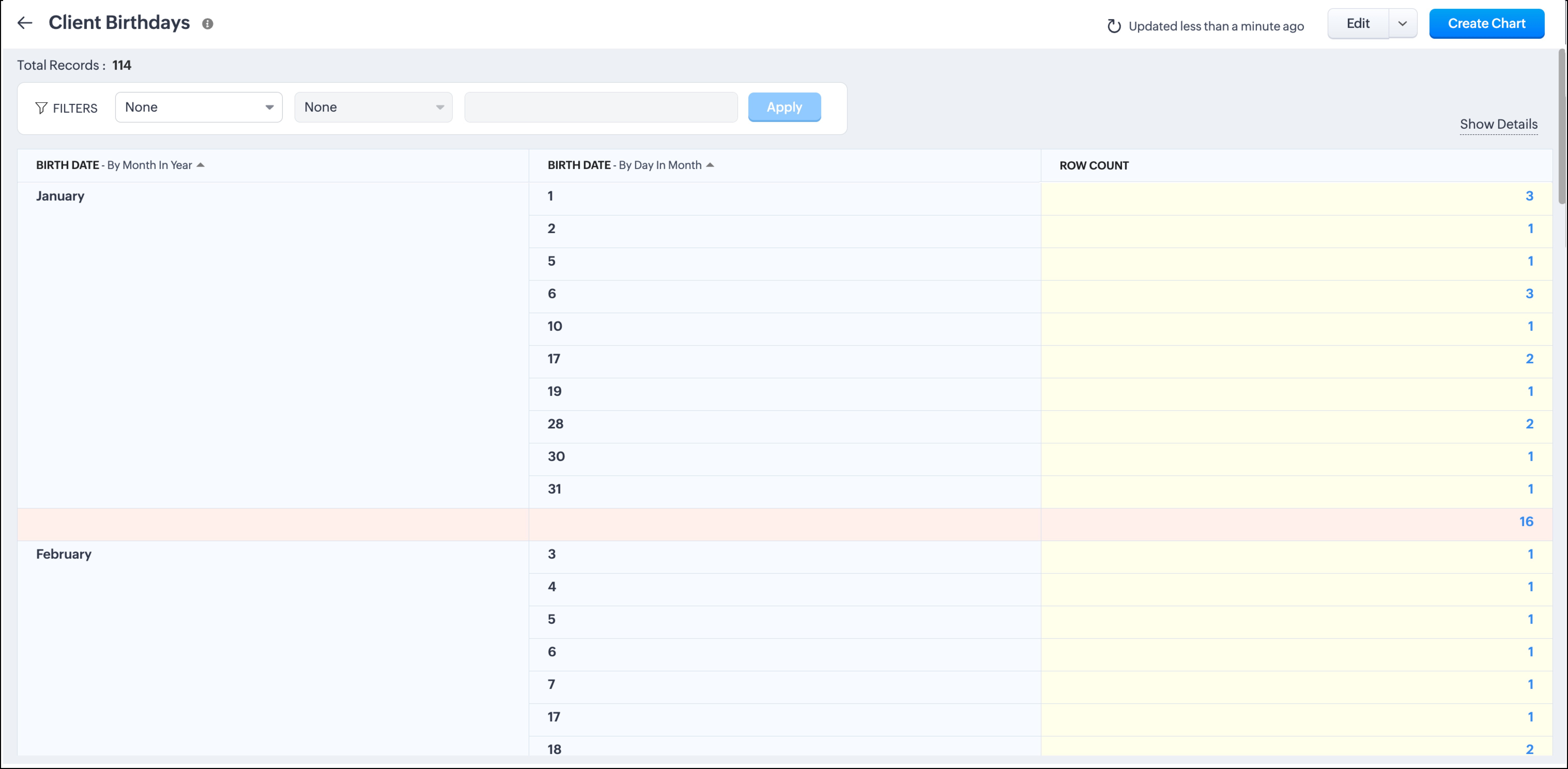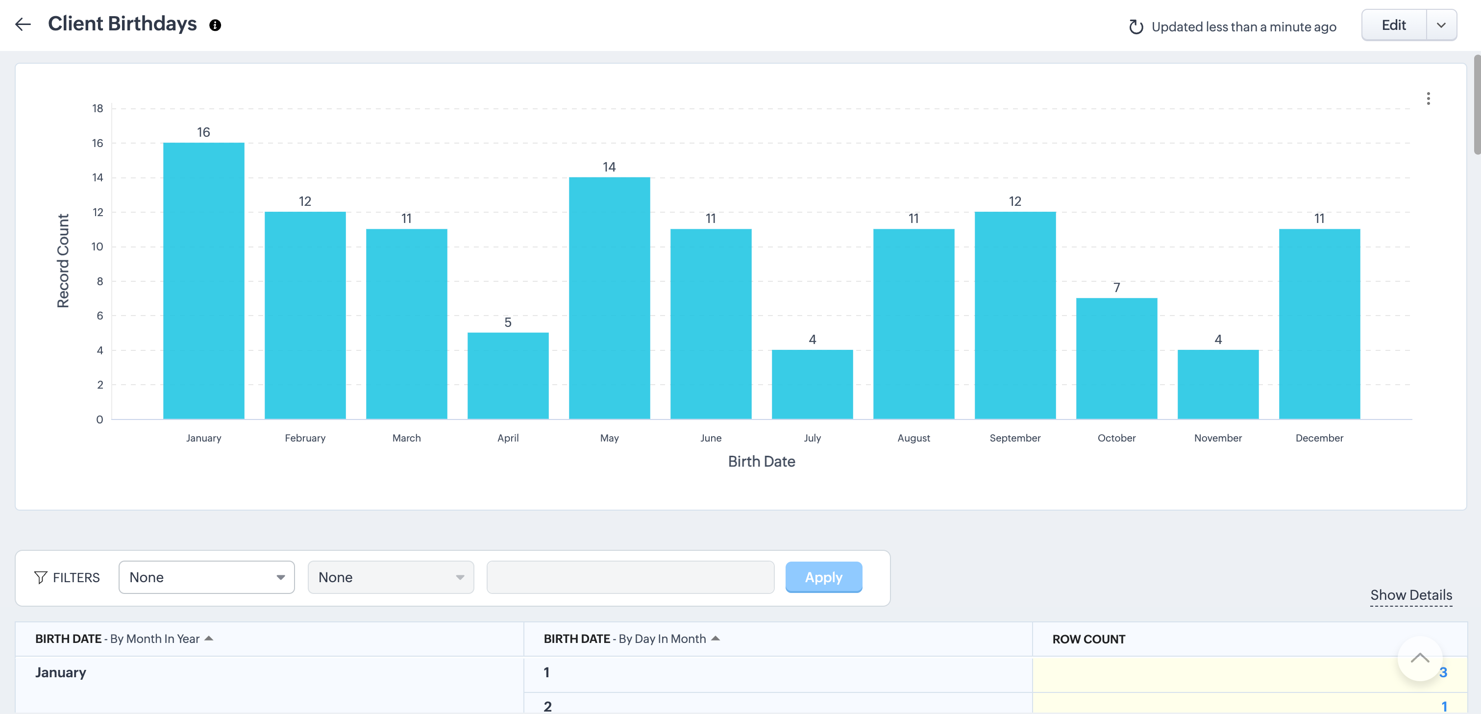 新しい「月の日別」単位の機能により、データを日ごとにグループ化できるようになり、レポート内での詳細な日次分析が可能になりました。これにより、使用量のピーク日の特定、使用量の異常の検出、1つのレポートでの連絡先すべての誕生日の表示などが可能になります。