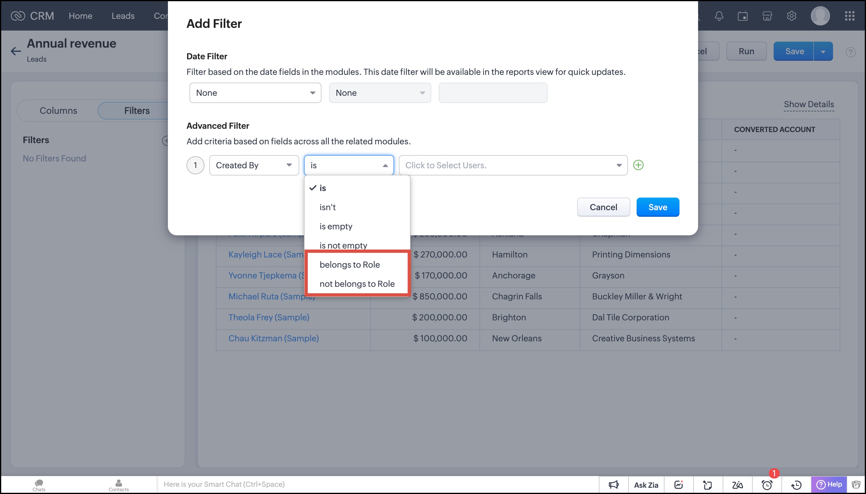 例えば、レポートにアクセスするユーザーの役職に関連する見込み客または販売データのみを表示するようにレポートを作成することができます。異なる役職を持つユーザーは、異なるデータセットを見ることができ、各自の役職に関連する情報のみにアクセスできるようになります。