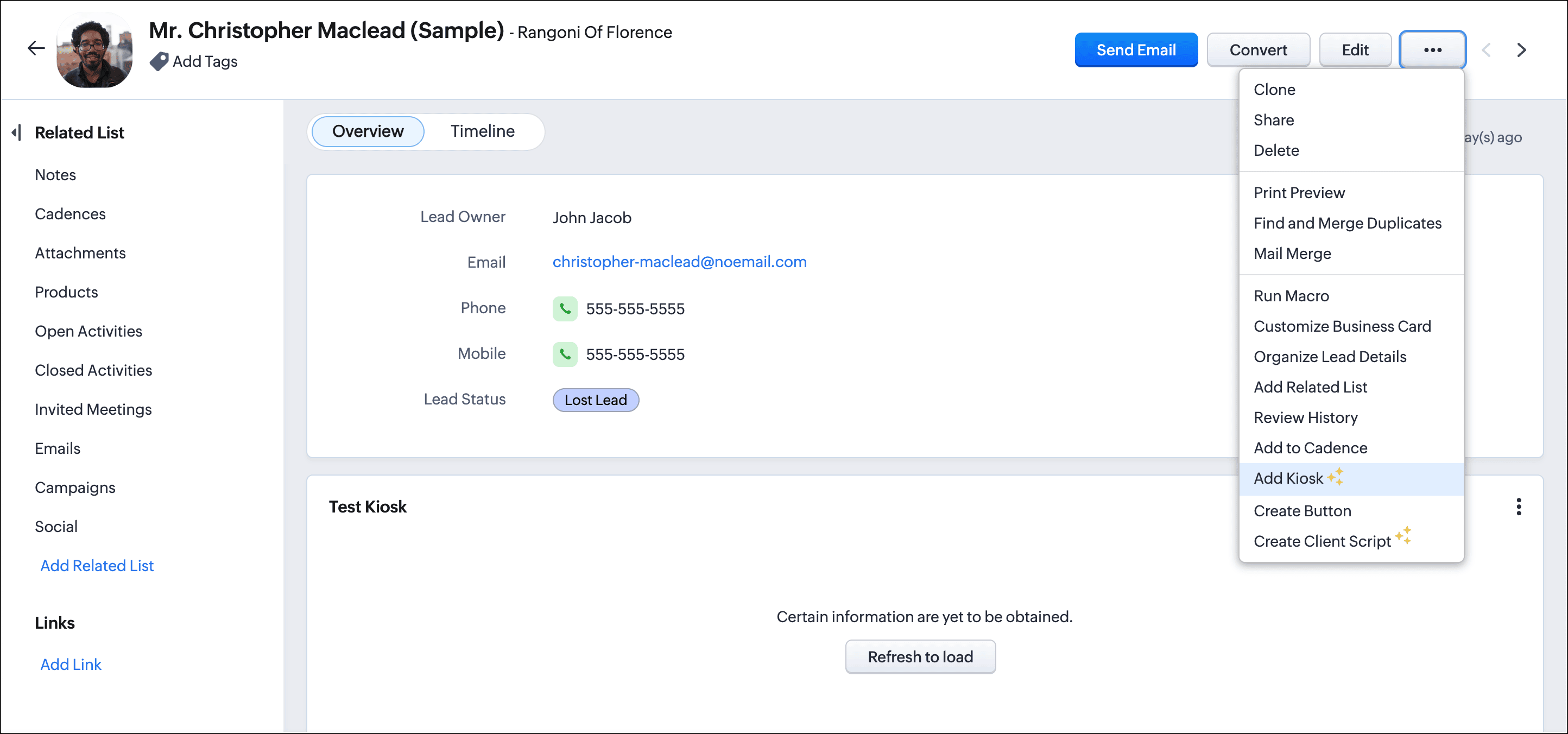 連絡先や見込み客のデータ詳細画面にキオスクを追加できるようになりました。